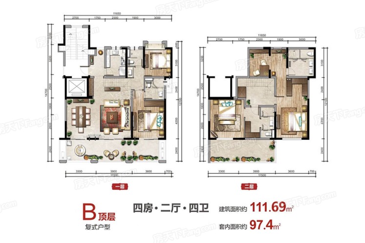 合欢洋房顶层复式B户型-4室2厅4卫-111平